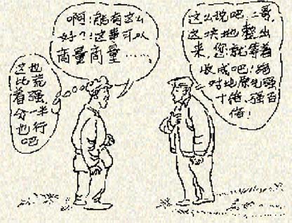 可是年复一年,王二开始有了不同的想法,有点不大情愿给别人一半的收成了。王二心想:这地本来就是我的,也是我种的,为什么我的收成要平白无故分给别人一半呢?