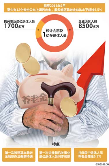 近日,随着江苏、安徽、广西省退休人员基本养老金调整方案出台,据不完全统计,目前至少有12个省份公布上调养老金。同时,很多地区的养老金总体水平超过6.5%。 图/CFP