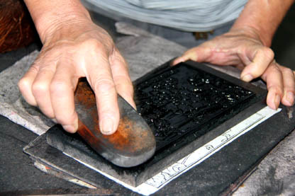 “用棠梨木做活字,每个字块大小高低都一样,在装置活字的木框里,每个字行之间都用木栏夹紧,固定好的模板就可以用直接用于印刷了。” 印刷用墨则是一个很讲究的技术活儿,不慎就会导致拓印失败。如果失败了会有两种情况,一种会因为墨多了,字印显得湿而模糊,另外一种因为量少了而字印不清或偏白。王士生刚拓印好的这一张,不干不沾,图案字迹清晰,显然比较成功。