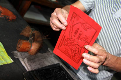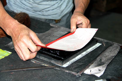 “天气干燥动作要快,天气湿润的话可慢一点。”王士生先用刷子在印刷母板上刷上水,过了几分钟再快速均匀地刷上墨汁,接着在母板上覆上印刷纸张,随即用棕刷子在纸张上面刷拓,一连贯的动作一气呵成,不一会儿的功夫,一张拓印好的精致样张就展现在了眼前。