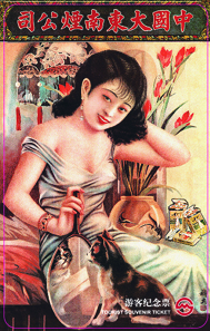 第二枚地铁纪念卡的画面,是中国大东南烟的广告,画中女子穿时髦的低胸衣,手拿一柄镜子,红花配一只慵懒的猫,此情此景不免让人吟诵起温庭筠的词句“懒起画峨眉,弄妆梳洗迟”。
