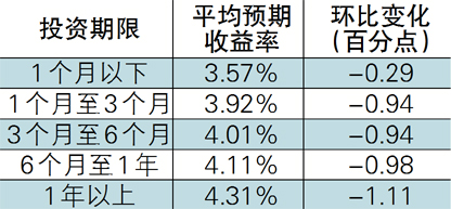 收益表现:银行理财产品收益水平逐月下滑,1年以内期限产品已跌破4%