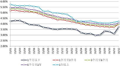 2016年市场利率整体保持持续下滑态势,带动银行理财产品收益水平出现下降。除了年中、年末两个月份受资金面趋紧影响有所反弹而外,其余各月均表现为不断下滑之趋势。尤其是进入下半年后,半年以内的各期限段人民币理财产品的平均预期收益率均保持在4%以下,6-12月期限段产品在8月份后也跌破4%。(表1、图4)