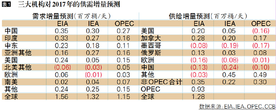 EIA仍然保持了对美国增产幅度的乐观预测,认为2017年美国石油供应将同比增长20万桶/日,即同比增长1.4%。IEA则扭转了此前美国可能在2017年继续减产的观点,但预计2017年美国供应的同比增量可能仅为5万桶/日,即同比增长0.4%。而OPEC仍然认为美国明年将出现16万桶/日的产量下滑,其中致密油产量将下滑28万桶/日,抵消墨西哥湾原油12万桶/日的同比增量。