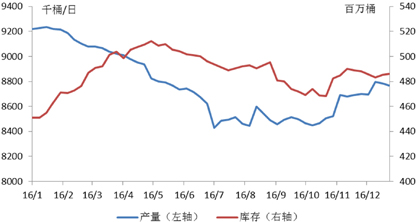 12月23日当周美国原油平均日产量为876.6万桶,较2015年末下降43.6万桶/日,但较7月的低点上升了32.1万桶/日。美国原油产量在2016年呈U型走势,2017年将延续上升态势,预计到明年二季度可重新迈上每日900万桶大关。