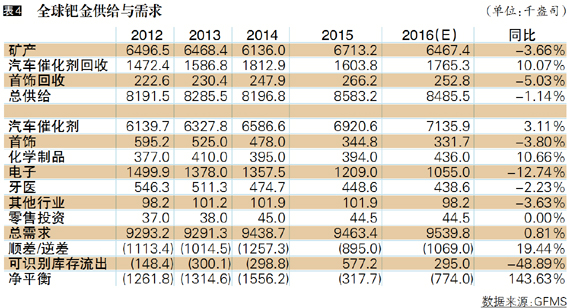 2、钯金:需求继续增长,供需缺口持续保持较高水平(表4)