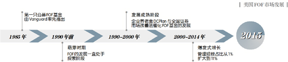 FOF起源于美国,从FOF发行机构的角度来看,1985年3月,美国市场第一只真正意义上的FOF由先锋基金率先推出。此后的15年间,发行FOF的资产管理机构增加至37家,FOF基金数量在1999年底增至124只,资产管理规模为433亿美元。1999年末近90%的资产集中在前十大FOF公司。其中,前三大公司分别为先锋、普信、富达。1990年美国市场仅有20只FOF基金,管理总资产为14亿美元。2002年以来,美国FOF快速发展,总规模从2002年的689.6亿美元一举上涨到2015年的17216.2亿美元,并且除2008年金融危机以外,其余年份均保持增长;同时FOF的总数量也从2002的268只上涨至2015年的1404只。