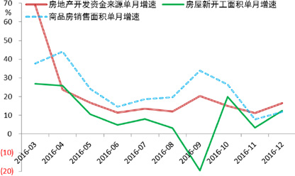 从2016年12月数据看,消费受春节假期较往年提前的影响而继续好转,社会消费品零售总额同比增速10.9%,增速系2016年最高。但工业和投资数据明显转弱,12月规模以上工业增加值同比实际增长6.0%,较上月下降0.2个百分点;12月单月固定资产投资单月增速6.5%,较上月大幅下降2.3个百分点,其中房地产开发投资增速11.1%,较上月提升5.3个百分点,主要是投资对销售的滞后效应以及政策快速收紧后的恢复性增长使然。