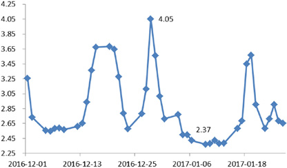 2017年1月7天期回购利率月度中枢较2016年12月的3.01%下降33bps至2.68%,虽然资金价格有所下降,但受到春节时点以及市场对央行后续政策预期谨慎等因素影响,资金面整体稳中偏紧。具体看,1月上旬扰动因素不多,对于1月中旬到期的中期借贷便利(MLF),市场也早有续作消息传出,因此资金利率稳中有降。进入1月下旬,资金利率中枢抬升,出现持续偏紧态势。原因一是由于春节前两周左右,提现需求通常逐步升温,再叠加缴税、缴准等因素扰动,资金面压力逐渐加大。二是央行向市场传递出的援助信号不及预期。虽然央行通过临时流动性便利操作(TLF)为在现金投放中占比高的几家大型商业银行提供了临时流动性支持,应对春季前压力,但又在24日开展六个月和一年期MLF操作时分别将利率上调10个基点,是MLF操作开展以来首次升息,其综合效果是终结了市场对TLF的乐观预期,强化了央行去杠杆的预期。(图3)
