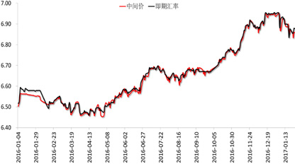 2017年1月,人民币对美元的贬值步伐突然中断,对美元最高触及6.8295(1月18日),1月底收报6.8807,较去年底升值约1.0%。