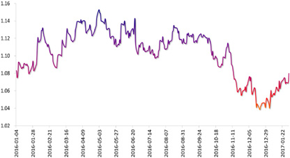国际外汇市场目前正在经历“特朗普行情”降温的过程。2016年11月8日特朗普胜选之后,国际汇市热炒特朗普新政对美国经济的积极意义,快速推高了2017年的通胀预期和美联储加息预期,导致美元指数大幅飙升。2016年12月中下旬开始,随着特朗普就职日期的临近,市场开始正视特朗普一系列激进政策主张的推行难度,美元上攻步伐随即停止。此后特朗普本人表态明确反对强势美元,对美元进一步构成压力。在特朗普胜选之前,美元指数在98附近波动,而截至1月底,美元指数报收99.55。从市场乐观情绪降温的角度看,美元指数仍有进一步回落的可能,而这对欧元构成短期利好。