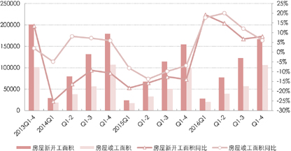 2016年三季度以来,虽然各类紧缩政策接踵而至,但商品房销售面积增速仍处于高位,增幅缓慢下降的趋势未改。从累计数据看,2016年房价累计涨幅较大的局面没有变化,全年销售面积超过15亿平方米,政策收紧导致成交端增速放缓却难掩全年行业销售规模再创历史新高之“喜”。随着政策效应积极释放,部分城市房地产市场过热态势受到遏制,市场交易和市场预期也开始理性回归。2017年,调控政策仍将延续,针对房地产业的资金控制也将趋于严格,销售面积增速仍将延续放缓趋势。