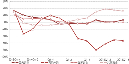 图6 2013年-2016年房地产开发企业季度累计到位资金来源同比情况