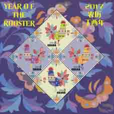 在各国2017年发行的“鸡年”邮票上,运用金色来作为图案的并非菲律宾一国,还有许多国家或地区发行的“鸡年”邮票上也同样采用金鸡来营造喜庆氛围,并结合了一些特殊印制工艺,让人感到耳目一新。如马达加斯加发行的“鸡年”小型张就以金鸡为主图,再辅以异形票幅,同样显得很出彩。英属泽西岛在红底的衬托下,一只金色的雄鸡跃然纸上,加上中国吉祥花卉纹饰,言简意赅地凸显了主题思想。列支敦士登继续以镂空的剪纸风格表现“鸡年”,小全张的外围则延续异形风格,使用了昂首挺立的公鸡形象,而邮票四周的面值、国名和中文“鸡”使用烫金工艺。