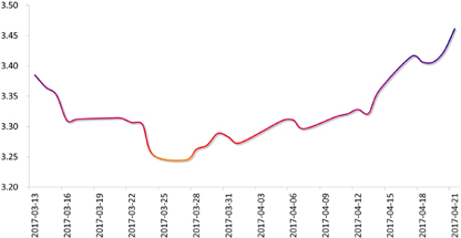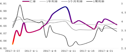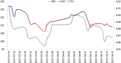 外汇市场:上周,英国首相特雷莎·梅宣布提前举行大选,英镑快速上涨,美元指数相应承压,大多在100下方波动。人民币兑美元价格维持窄幅区间波动,周五收于6.8838,较前一周小幅上涨0.05%。