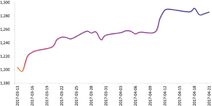 商品市场:上周,黄金价格从前期高位回落,但法国大选带来的不确定性,以及朝鲜半岛紧张局势尚未缓解带来的避险情绪仍对金价形成一定支撑。周五收盘于1286美元/盎司,较前一周小幅下跌0.32%。