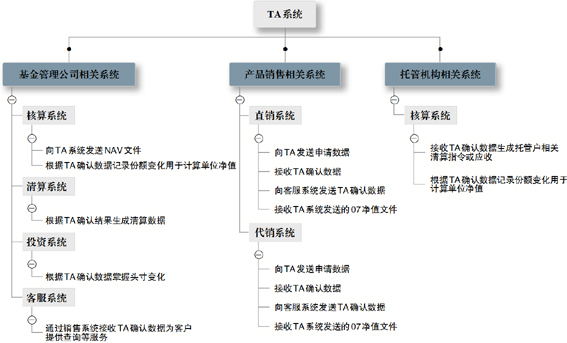 与TA系统交互较为密切的系统包括基金管理公司内部的核算系统、清算系统、客服系统和投资交易系统,直销和代销机构的销售系统以及资产托管银行的核算系统,上述关联方和系统间相互依附,通过数据交互实现各自业务处理的目标。(图1)