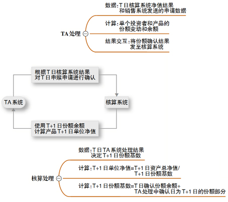 不仅是基金公司内部系统、销售系统分别与TA系统存在数据交换行为,托管机构的核算系统也需要使用TA确认数据并以此作为计算次日单位净值的份额基础。托管机构核算系统作为负责基金产品净值复核的系统,单位净值计算过程中使用的产品总份额信息同样也是源自于TA系统的份额基数。在不考虑实时TA④处理情况下,T日发起申请产生的份额变化通常会在T+1日得到管理人的确认⑤,所以T+1日核算系统的份额基准数量即可通过T日日终份额+T+1日应该被确认的份额数量加总得出。总体来看,基金公司内部的核算系统和托管机构的核算系统与TA系统交互方式类似,数据使用规则基本相同。