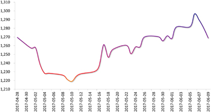 商品市场:上周,政治经济风险事件密集,在此之前,市场谨慎情绪弥漫,国际金价持稳于七个月高位附近;随后,由于英国大选产生的不确定性提振美元,金价承压下跌,周五收盘于1268.8美元/盎司,较前一周下跌0.99%。