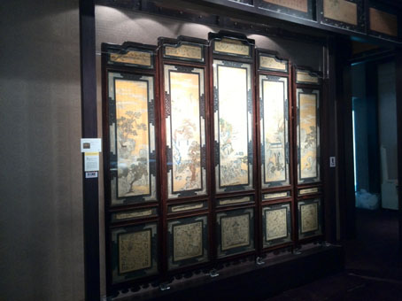 清乾隆紫檀框明黄色地双面缂丝仙山楼阁五扇屏风