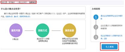 1.企业主管登录企业网银,进入“信贷融资-小微企业快贷-我要快贷”菜单,点击“马上授权”按钮,根据提示操作授权企业主通过个人网银申请快贷;