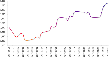 商品市场:上周,美国总统特朗普与朝鲜领导人口头交锋激烈,朝鲜威胁采取军事行动,市场避险情绪上升。国际金价周五收盘于1288.77美元/盎司,较前一周上涨2.41%。