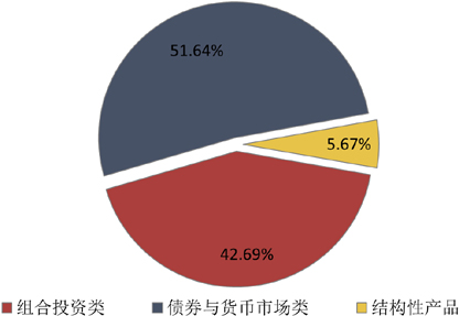 从投向类型来看,债券与货币市场类产品发行了4752款,环比减少801款,市场占比上升2.75个百分点至51.64%;组合投资类产品发行了3928款,环比减少1073款,市场占比下降1.34个百分点至42.69%;结构性产品发行了522款,环比减少283款,市场占比下降1.41个百分点至5.67%。(图4)