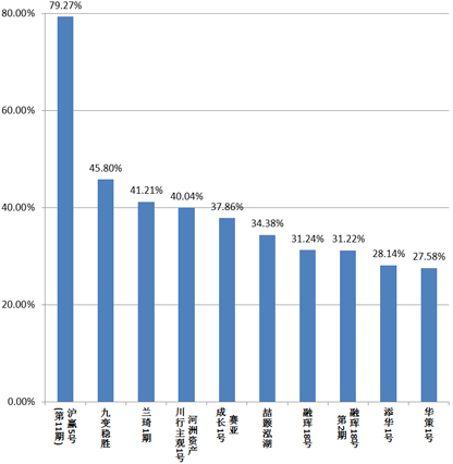 从资金运用领域看,房地产领域产品发行了71款,占比为30.08%,环比上升1.08个百分点;工商企业领域产品发行了50款,占比为21.19%,环比下降1.31个百分点;金融领域产品发行了46款,占比为19.49%,环比下降1.51个百分点;基础设施领域产品发行了46款,占比为19.49%,环比上升1.99个百分点;证券投资领域产品发行了10款,占比为4.24%,环比上升2.24个百分点;其他领域产品发行了13款,占比为5.51%,环比下降2.49个百分点。证券投资领域产品发行继续上扬,考虑到许多私募机构仓位都创自2015年股灾来的新高,不排除该类产品发行数量进一步上涨的可能性。