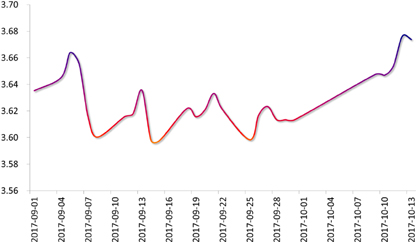 外汇市场:上周,由于欧洲经济数据强劲、西班牙政治风险暂缓和美联储9月会议纪要不及预期鹰派, 美元指数震荡下跌,人民币顺势上涨。加之十九大召开在即,央行行长周小川呼吁放松外汇管制,市场看多人民币情绪升温,但由于客盘购汇力量增强,人民币回吐部分涨幅,周五收于6.5868,当周累计上涨0.91%。短期人民币料将延续区间波动。