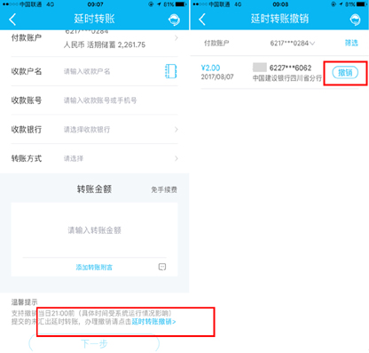 95533答:在延时转账资金转出前,您可通过手机银行撤销。具体流程为:登录建行手机银行,依次点击“首页-转账-延时转账”,在延时转账页面下方温馨提示栏点击“延时转账撤销”,选择付款账户(手机银行签约账户)、需撤销的转账交易后,点击“撤销”即可。(客户服务中心)