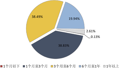 从投资期限来看,1个月以下产品发行了11款,环比减少5款,市场占比下降0.03个百分点至0.13%;1-3个月产品发行了3199款,环比减少657款,市场占比下降0.59个百分点至38.83%;3-6个月产品发行了3171款,环比减少453款,市场占比上升1.44个百分点至38.49%;6-12个月产品发行了1643款,环比减少374款,市场占比下降0.68个百分点至19.94%;1年以上产品发行了215款,环比减少55款,市场占比下降0.15个百分点至2.61%。(图3)