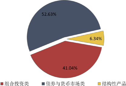 从投向类型来看,债券与货币市场类产品发行了4336款,环比减少619款,市场占比上升1.98个百分点至52.63%;组合投资类产品发行了3381款,环比减少800款,市场占比下降1.70个百分点至41.04%;结构性产品发行了522款,环比减少125款,市场占比下降0.28个百分点至6.34%。(图4)