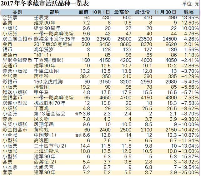 编者按:11月中旬的初雪,将人们带入了冬季,藏市的人气也开始下降。当然相对于气候而言,今年藏市的温度一直处于冬季,低迷的市况并没有形成春暖花开抑或夏日酷热的表现,相反市场热点溃散、交易不兴、人气低迷的状态延续到11月末,且仍没有任何的改观迹象。虽然10月份以来,藏市上的大量邮币品种跌幅出现了明显收敛,但是阴跌的走势并没有改观,且大多数品种的买卖差价重新显露出放大迹象,这无疑说明了市场上的投资者对藏品价格认同差距的扩大,也在一定程度上反映出成交的难度进一步增加,而最终的结果就是交易难现,成交量的明显下降。
