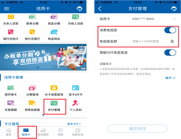 95533答:可以的。您登录建行手机银行,依次点击 “信用卡-支付管理”,选择对应的信用卡卡号,将“消费免验密”选为“是”即可设置免验密金额,免验密金额可设置在1-500元以内。