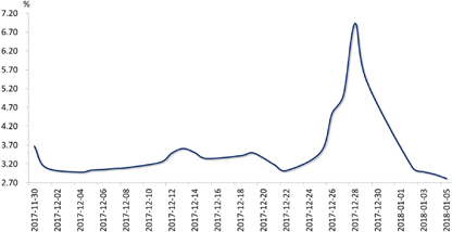债券市场:受12月财新中国制造业PMI创四个月新高、国开行重启发行10年期国开债、大宗商品价格上涨推升通胀预期,以及强监管政策延续的影响,上周前三个交易日10年期国债收益率上行。后随着一级市场新券发行偏暖,且市场对监管趋严的反应有所缓和,10年期国债收益率下行。截至上周五,10年期国债收益率较前一周上行4BP。