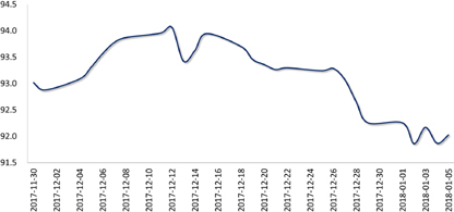 新年第一周,美元指数仍然延续弱势,一度跌破92关键支撑位。在此影响下,加之在岸人民币中间价突破6.5及外汇储备11连升等因素推动,离岸人民币显著上涨,全周大部分时间运行在6.5以下,周五收于6.4791。离岸人民币各期限掉期点保持稳定,市场流动性仍然充裕。