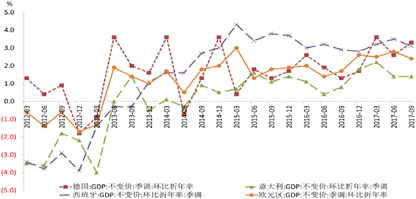 2018年全球经济增速有望加快,预计由2017年的3.6%升至3.7%,在强劲外需的支撑下,欧元区出口料将继续增长,带动工业产出积极向好,企业资本支出或将稳步回升。此外,欧元区还实施积极的财政政策支持经济复苏,德国2017年起每年为企业和经济发展减税150 亿欧元,法国宣布2018年强制性征税金额将减少约70 亿欧元。在欧元区内部,经济复苏也已经从德国、法国等表现较为稳定的经济体扩散到过去表现欠佳的意大利、西班牙等国,这些国家债务问题明显改善,欧元区经济发展不均衡的情况预计将进一步缓解。(图1)
