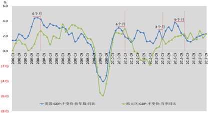 此外,历史数据显示,美国经济通常领先欧洲经济1-3个季度,传导路径为美国经济率先复苏,导致美元走强、欧元走弱,刺激欧洲出口和就业增长,进而带动欧洲经济复苏。2017年二、三季度美国GDP年化季环比增速均超过3%,预计2018年欧元区经济也将保持较快增长,预计增速在【1.9%,2.3%】区间,将为强势欧元提供基本面的支撑。(图2)