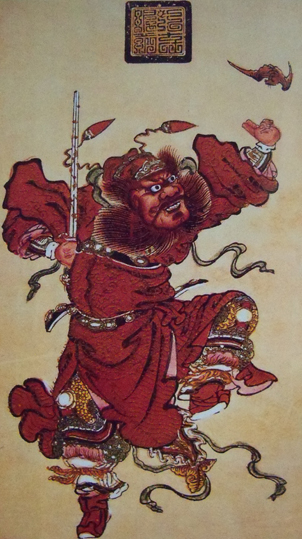 《山海经》记载:神奈与郁垒这两位神,原来是东、北鬼门的护守,以苇索捉恶鬼,用桃弓射死,尸首就用来饲虎。人为着抵御邪魔,特地在内门旁树小桃人,系苇索,并把他们和虎的形象,都画在大小门上。为什么要制“桃人”?因为桃是“五行之精,厌伏邪气,制百鬼”,至于设色方面,那时是用彩色的漆画的。