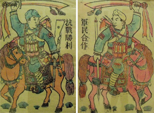这幅有我国著名版画家彦涵先生创作的以门神为题材的版画,体现出抗战胜利兵民的胜利喜悦,同时也说明抗战的胜利是由军民的合作这一决定性因素。抗战胜利文艺工作者把兵民作为门神题材,说明当时人们思想的解放,我们不靠神来保佑,靠的是兵民合作,没有战胜不了的强敌,对于鼓舞人民的斗智,起了极大地促进作用。
