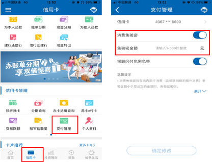 95533答:可以的。您登录建行手机银行,依次点击 “信用卡-支付管理”,选择对应的信用卡卡号,将“消费免验密”选为“是”即可设置免验密金额,免验密金额可设置在1-500元以内。