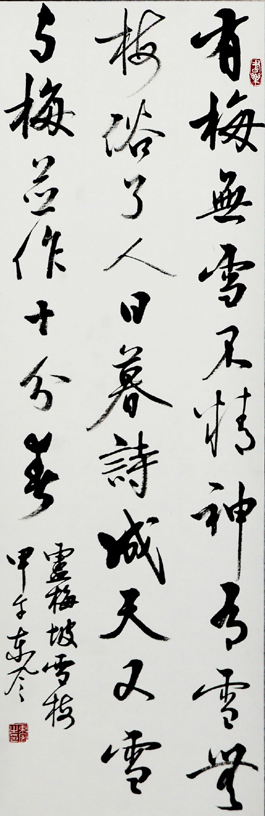 天赋异禀不能决定一切,后天努力才至关重要,崔哥对书法可以说痴迷,他练起书法永远不知道累。在大学,他把别人每天看电视的时间,都用来写书法;在基层部队,他负责教学工作,时间相对自由,课余,他差不多每天可以练习十个小时以上。对崔哥来说,练字是一个快乐的过程,同时也是一个磨练意志的过程。常常为了练好一个字或一个笔画,他不知要经历多少煎熬。好学不倦,使他的书法艺术不断进步,在系统内渐渐小有名气。然而人非生而知之,孰能无惑?书法艺术这个东西很奇怪,达到一定高度后,每提升一步都很难。一段时间,崔哥自觉光自己埋头苦练,已经很难有突破,创作也好似停滞不前。为了打破这个瓶颈,2006年他作了大胆决定,寻名师解疑惑,于是他报名上了北京市委党校开设的三年制书法本科班,毕业后,又上了清华大学书法研究生班,真是天命之年重回课堂,艺术征途又出发。数年时间,他克服工作、生活诸多难题,坚持书法学习,在课堂上,听名师教诲,与精英切磋,书法技艺大大精进;从临帖中,他更多地体悟了古人法帖之精华,明察到古人为书之道,不但知其然,亦知其所以然;创作中,将古代先贤书法艺术的神与魂,更多地融入了自己的作品中,着墨用笔,转折变化,章法笔法运用无不从心所欲,很快,他的行书艺术又上了一个新台阶。