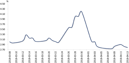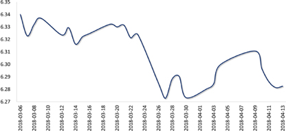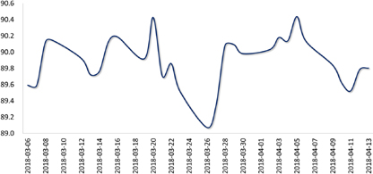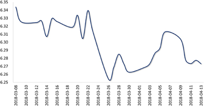 上周,受欧央行官员鹰派讲话和特朗普军事打击叙利亚的言论影响,美元指数承压下挫。但随后美联储公布鹰派会议纪要,加之特朗普对叙利亚的言论缓和,带动美元指数反弹,周五收报89.81,当周仍累计下跌0.37% 。此外,中国国家主席习近平和央行行长易纲在博鳌论坛关于扩大开放的表态,缓解了市场对中美贸易摩擦升温的担忧,一定程度支撑人民币汇价,周五收于6.2825,当周累计上涨0.28%。目前美元指数仍在90附近波动,人民币汇价也暂未明确未来方向,仍维持区间窄幅波动。
