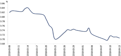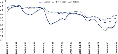 货币市场:上周央行公开市场净回笼900亿元。因清明假期,4月申报缴纳增值税、企业所得税等的截止期限顺延至4月18日。故7天回购利率以4月11日(上周三)为分界点,前期持续上行,上周三达到周内最高点2.90%,之后有所下行。截至上周五,7天回购利率较前一周三下行2BP至2.79%。