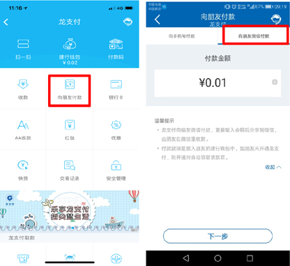 客户问:我看到手机银行龙支付可向朋友微信付款,请问如何操作呢?