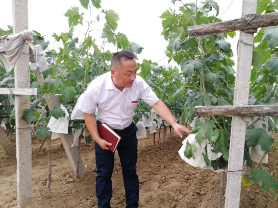 因地制宜,村里成立了葡萄种植合作社,文秀龙现场查看有机葡萄优良品种的生长情况。山东省分行/提供