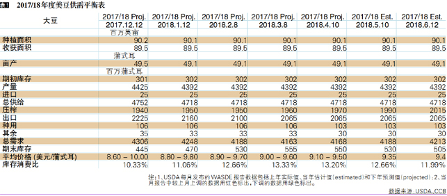 USDA供需报告:产量预测于1月供需报告调低0.33亿蒲式耳至43.92亿蒲式耳后,此后一直保持稳定,出口需求预测于1-3月连续下调后维持不变,压榨需求预测连续多次上调,6月报告上调压榨需求以及总需求0.25亿蒲式耳,期末库存下调至5.05亿蒲式耳,库存消费比从5月的12.66%下降至11.99%,整体看上半年的库存消费比先升后降。预测均价于6月报告中上调至9.4美元/蒲式耳,上半年预测区间逐渐收窄至9.3-9.4美元/蒲式耳。(表1)