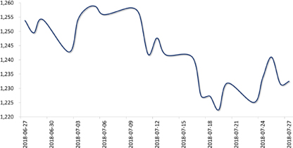 上周,欧美贸易摩擦缓和,加之美国二季度GDP增速4.1%创2014年以来新高,黄金投资吸引力下降,美元指数波动反复,黄金价格随之低位震荡。截至上周收盘,COMEX黄金期货价格当周小幅上涨0.05%至1232.5美元/盎司。