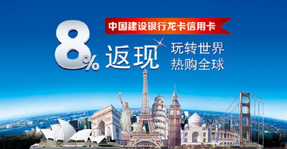 给力返现。建行信用卡正在开展多种境外线下刷卡发现活动,包括Visa、万事达、银联卡最高享受8%+3%返现,JCB卡享受笔笔8%返现。