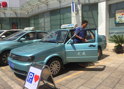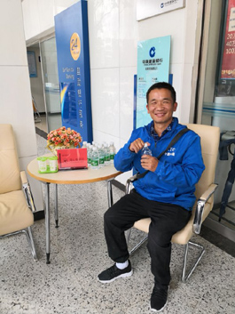 正在建行昆明体育城支行休息喝水的出租车司机张师傅